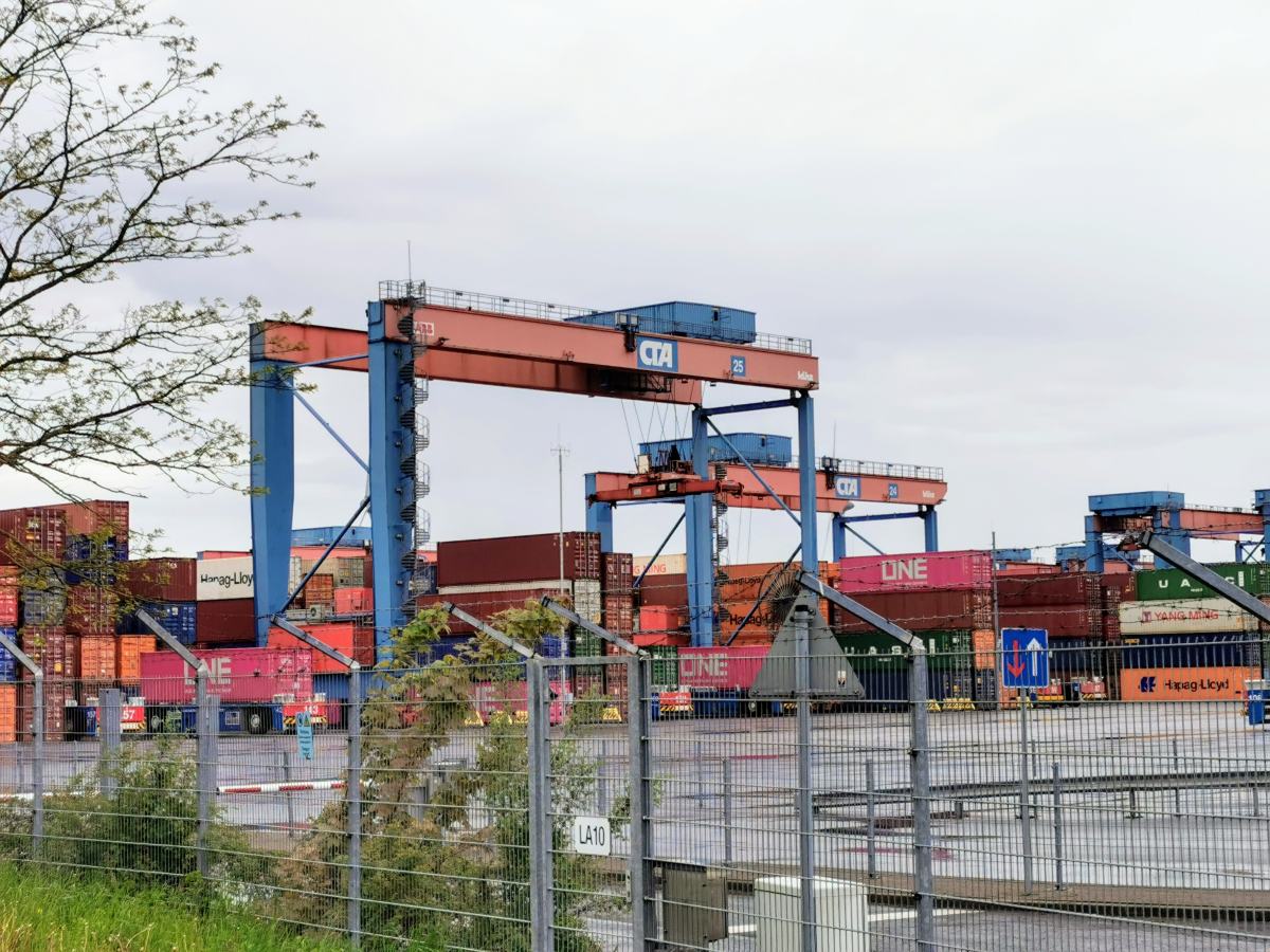 Der EUROGATE Terminal in Hamburg ist ein Seeschiff-Terminal für Container. Die Anlage befindet sich auf der ehemaligen Elbinsel Waltershof. Direkt auf dem Terminal befindet sich Deutschlands größter KV-Bahnhof der EUROKOMBI. Am Umschlagterminal für „kombinierten Ladungsverkehr“ (KV) erfolgt seit März 2020 die Abwicklung vieler Container Züge aus China. Für den Umschlage werden viele Portalkräne wie im folgende Bild zu sehen ist eingesetzt. Damit ergibt sich eine Alternative zum Transport per Containerschiff.